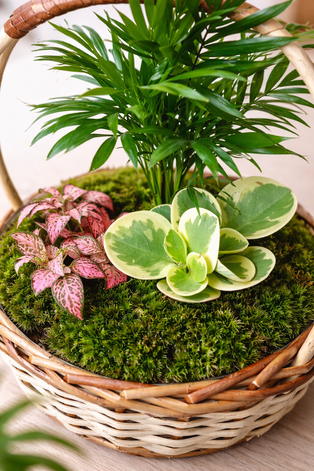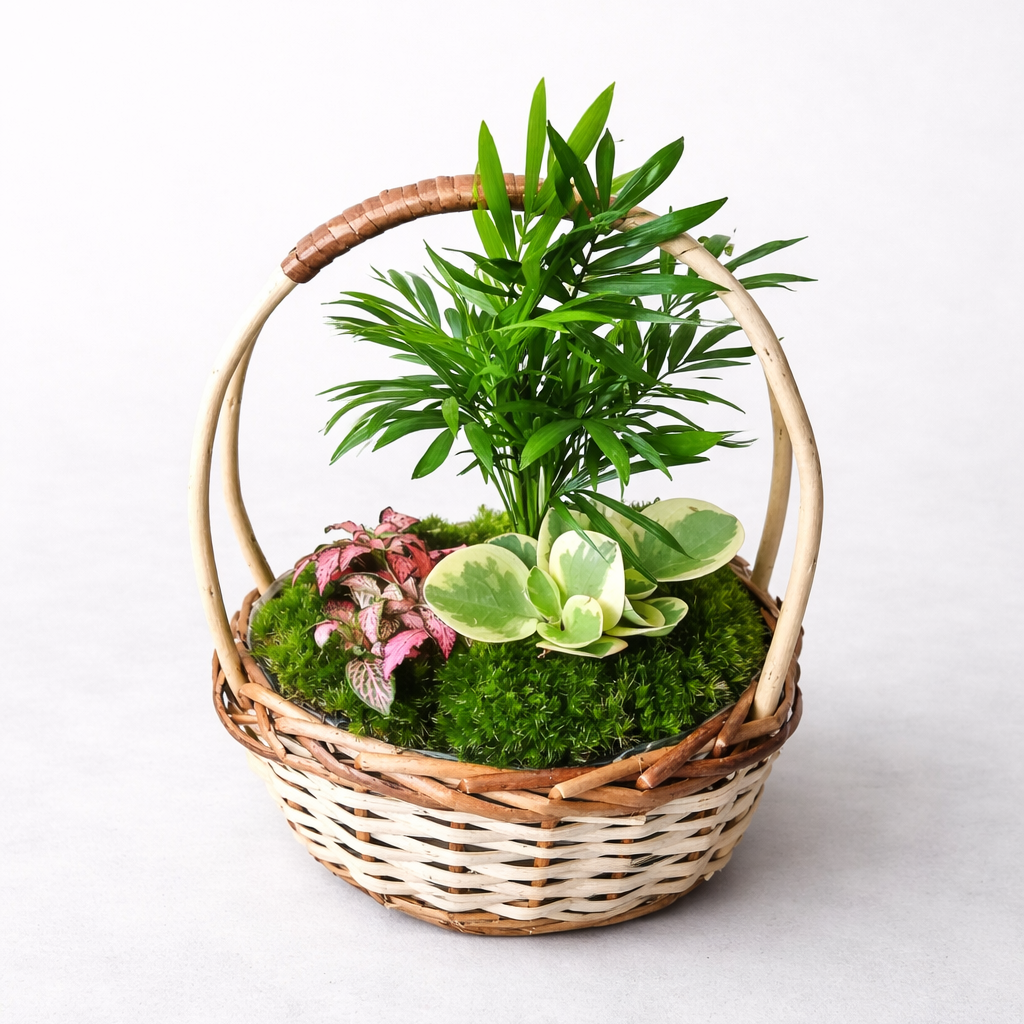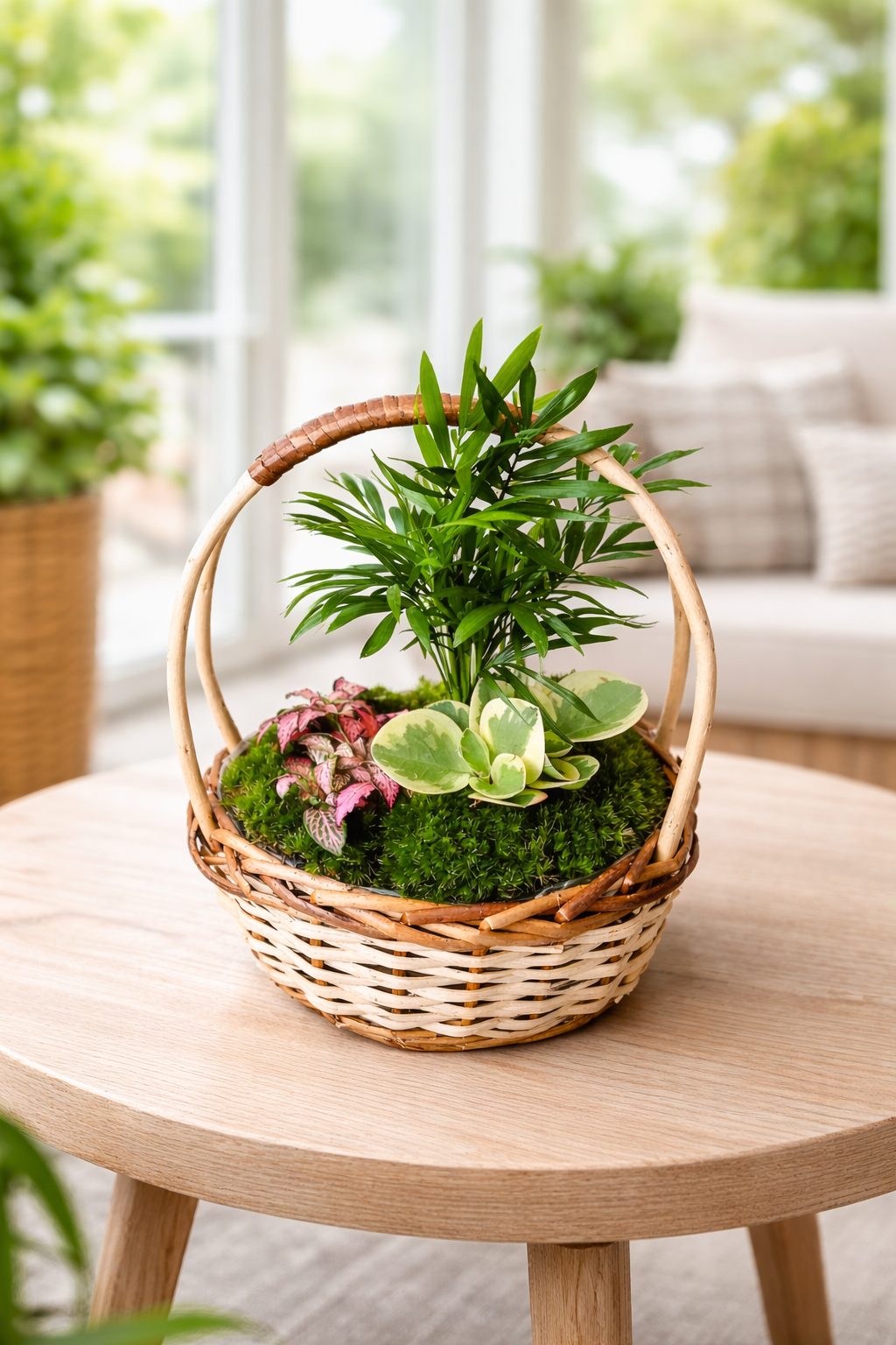 Composición vegetal de interior con distintas plantas de follaje, presentada en cesta natural. Aporta frescura, textura y un estilo botánico suave a cualquier espacio del hogar.
