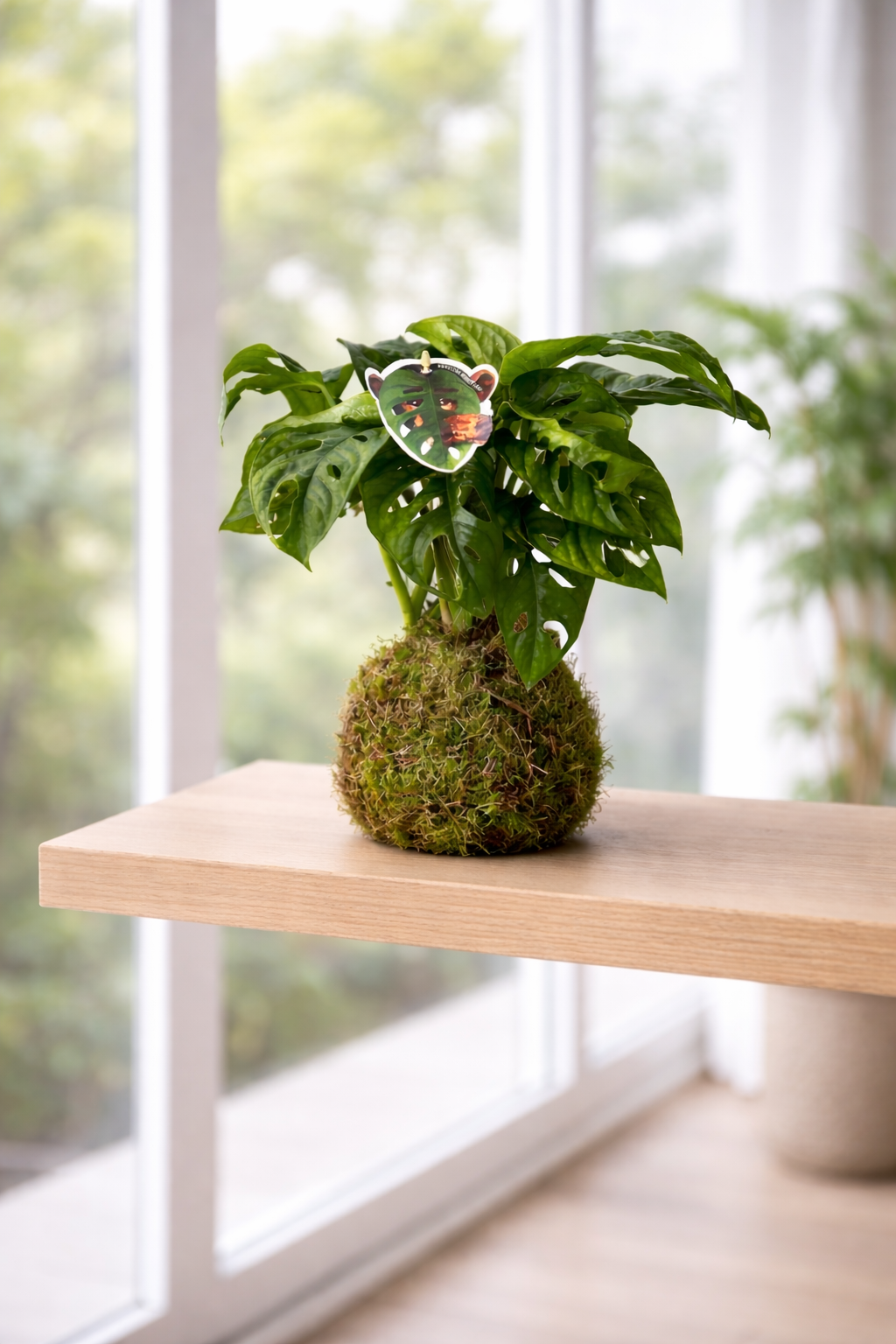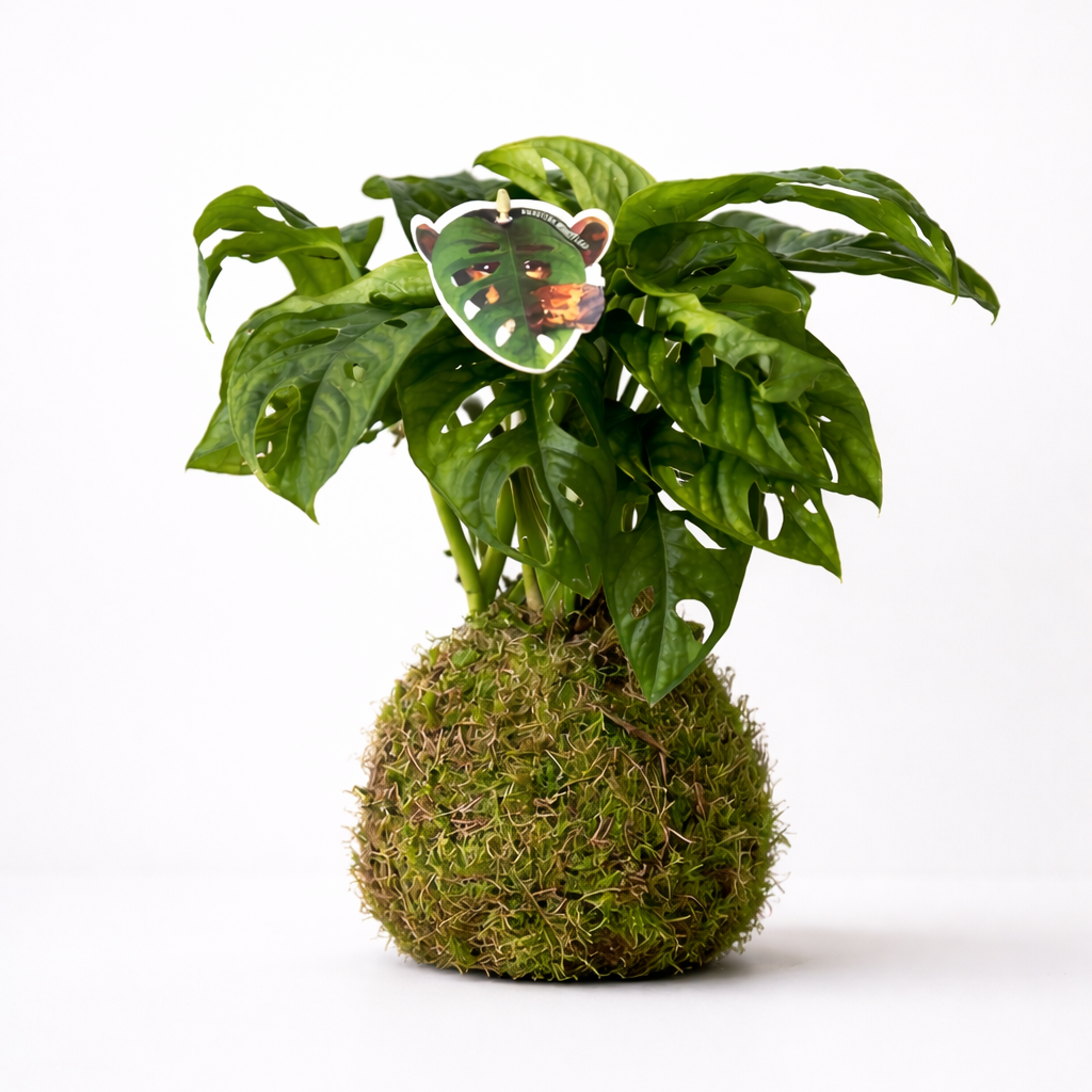 Kokedama artesanal de Monstera adansonii, conocida por sus hojas verdes con perforaciones naturales que aportan un estilo tropical y actual. Ideal para interiores luminosos, es una pieza decorativa original y fácil de integrar en espacios modernos. Perfecta para amantes de las plantas y la decoración natural.